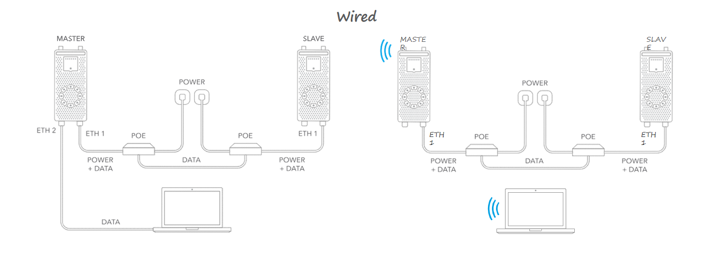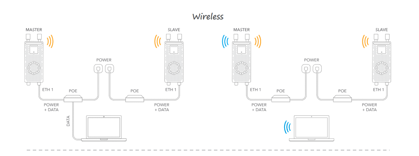下图显示了预配置 LigoPTP RapidFire 设备的多个选项。设备可以使用有线或无线连接相互连接。最终用户设备还可以使用 2.4GHz 接入无线电或使用有线方式连接到主设备的以太网端口。还可以使用 bonjour 和 SSDP 协议发现 LigoPTP RapidFire 设备。