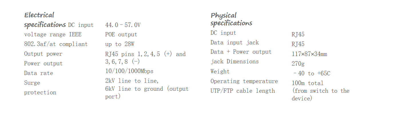 | 电源输出方式、电压 | PoE 802.3af,48VDC,最大12.95W |